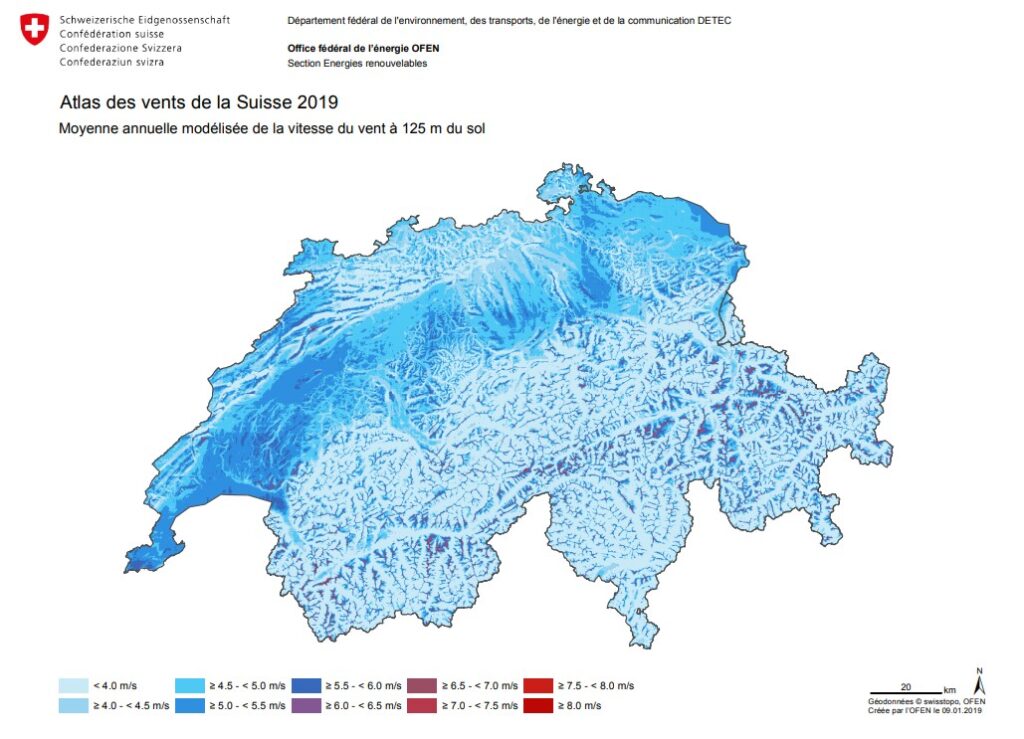 Contrairement à ce que laisse entendre le discours favorable au développement de l’énergie éolienne, la Suisse ne dispose pas de gisements de vent réellement favorables à une production électrique efficace et sûre. Le pays est enclavé au cœur du continent, entouré de massifs montagneux qui modifient profondément la circulation des masses d’air. Résultat : les vents y sont souvent irréguliers, faibles et turbulents — des conditions loin d’être idéales pour les grandes éoliennes modernes, conçues pour fonctionner de manière optimale à des vitesses de vent moyennes de 6 à 8 m/s.